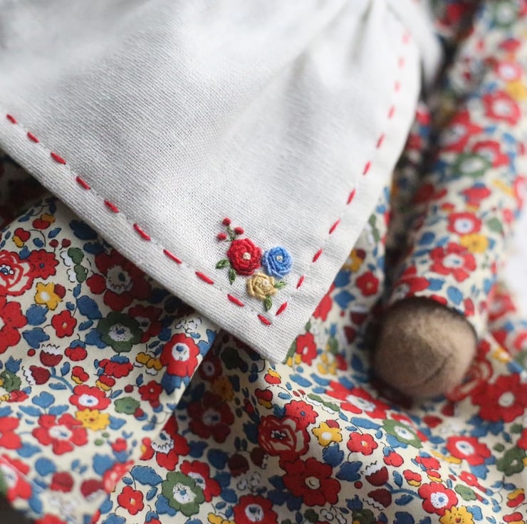 She is wearing a removable dress made from beautiful Liberty of London fabric with a little Peter Pan collar.