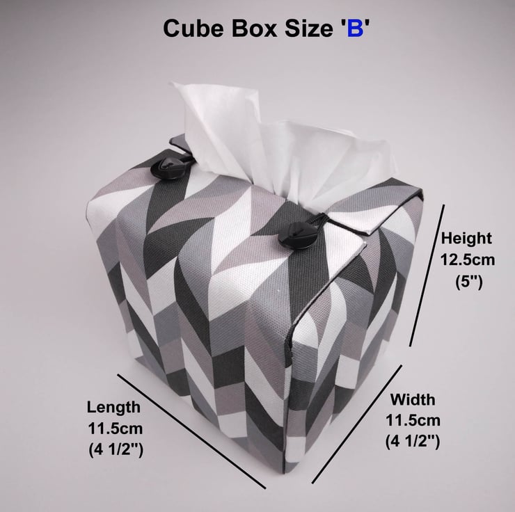 If your tissue box size is different than the measurements listed above, select the 'Custom Size' option and enter your tissue box measurements (height, width, and length) in the 'Custom Size' option box above.