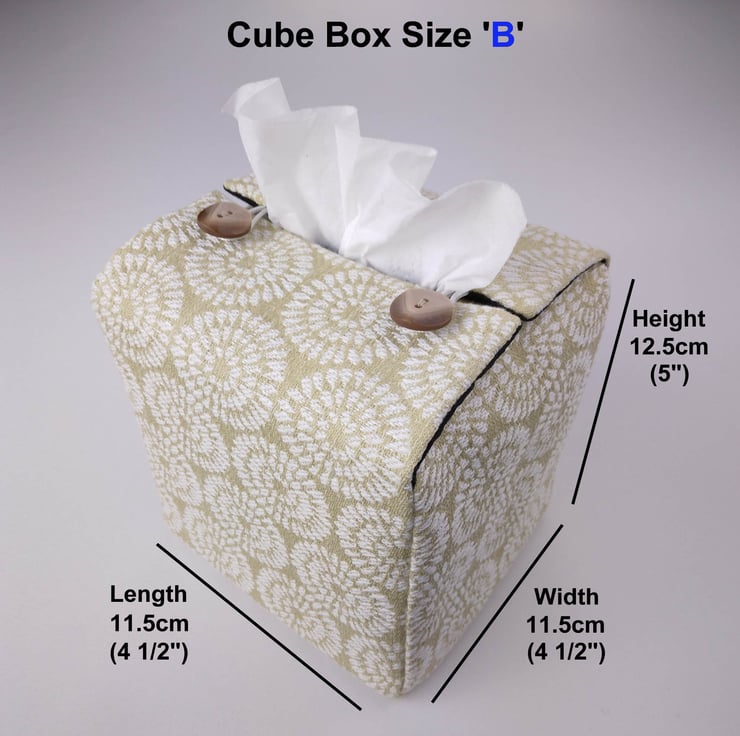 If your tissue box size is different than the measurements listed above, select the 'Custom Size' option and enter your tissue box measurements (height, width, and length) in the 'Custom Size' option box above.