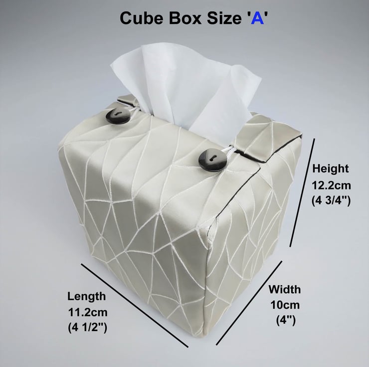 If your tissue box size is different than the measurements listed above, select the 'Custom Size' option and enter your tissue box measurements (height, width, and length) in the 'Custom Size' option box above.