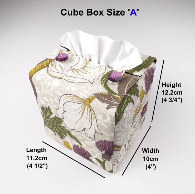 If your tissue box size is different than the measurements listed above, select the 'Custom Size' option and enter your tissue box measurements (height, width, and length) in the 'Custom Size' option box above.