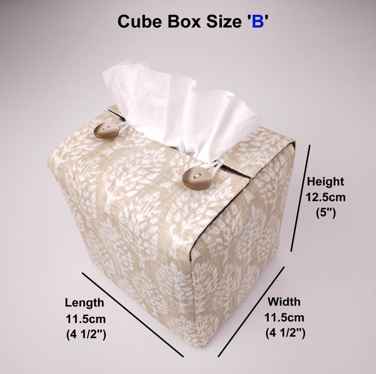 If your tissue box size is different than the measurements listed above, select the 'Custom Size' option and enter your tissue box measurements (height, width, and length) in the 'Custom Size' option box above.