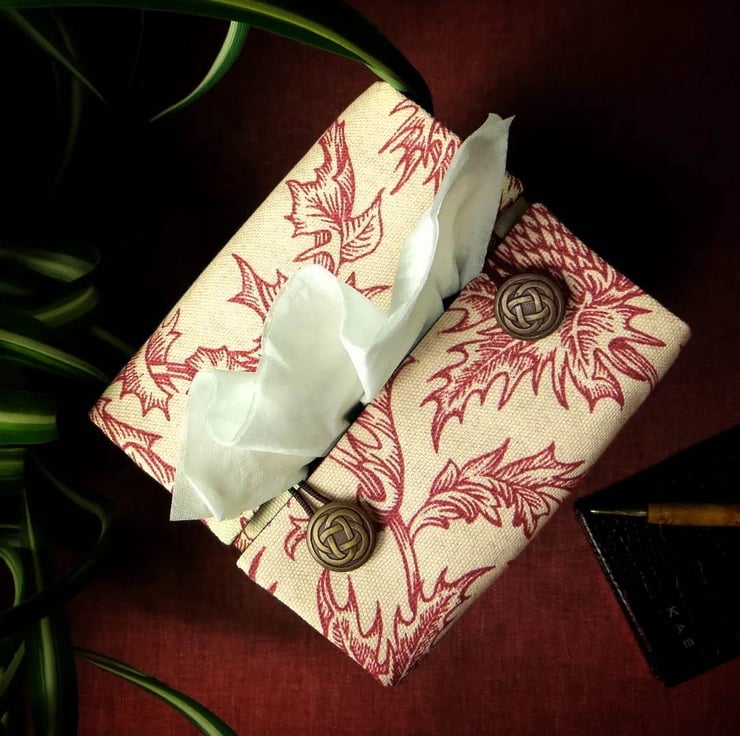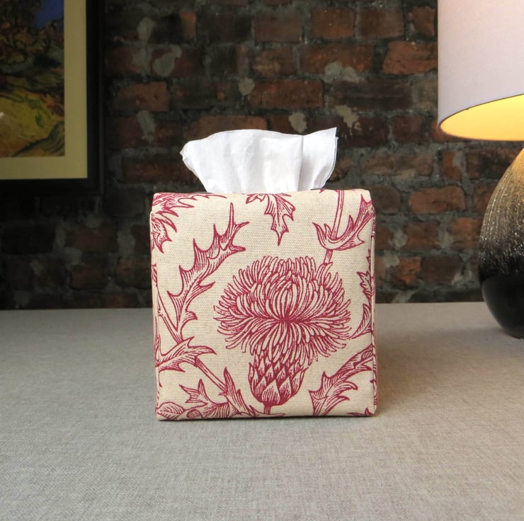 Red Thistle on Natural background, with solid black lining. Pattern placement varies.