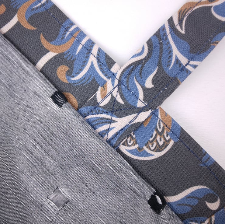 White, brown, and blue baroque style floral design on navy background, with metallic grey square patterned lining. Pattern placement varies.