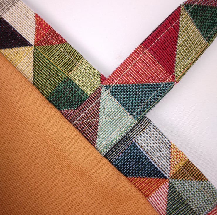 Multi colour diamond design, with solid orange lining. Pattern placement varies.