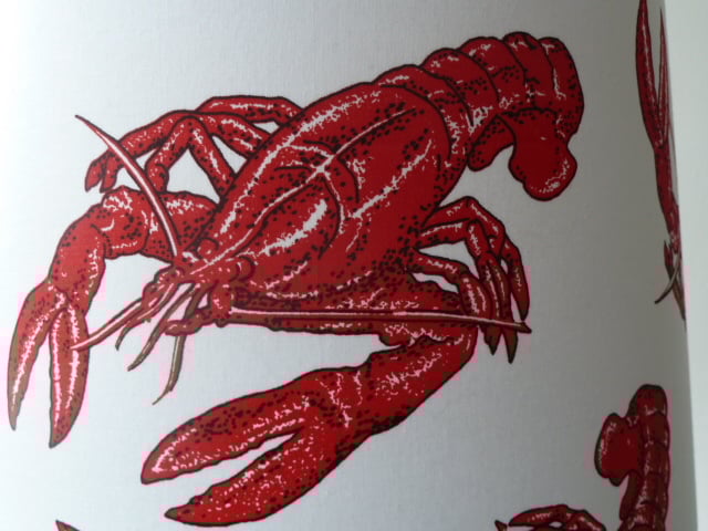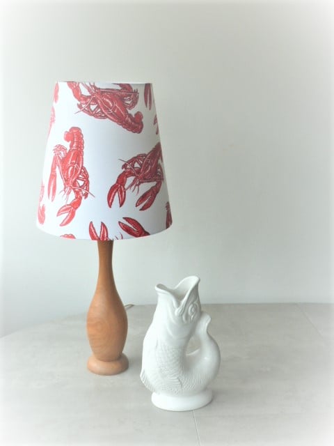 Fabulous red lobsters happily decorate this tapered lampshade. Available in other fairly large sizes ( lobster pattern size) - just contact me and I'll give you a price.