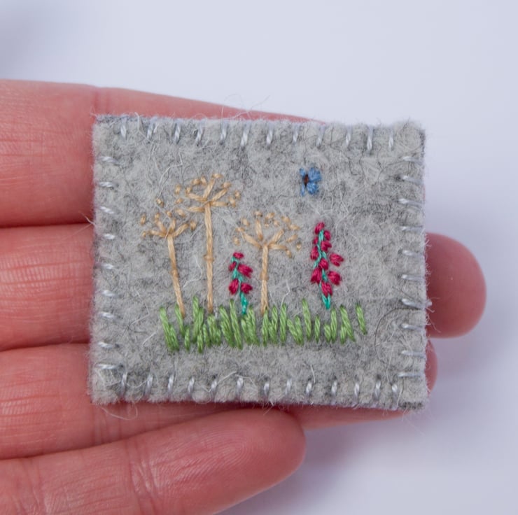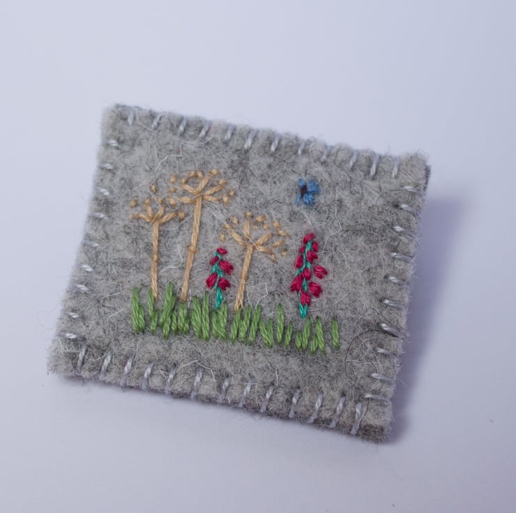 A sweet wool felt brooch hand embroidered with a wildflower meadow of foxglove and cow parsley with a common blue butterfly fluttering amongst them on a pale grey background. The embroidered design is attached to a thick piece of felt and is satisfyingly sturdy. It has a standard brooch back.