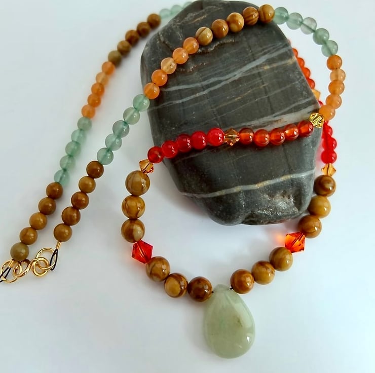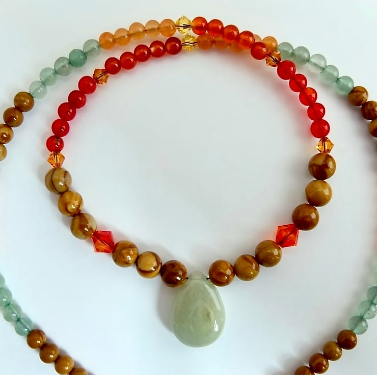 The necklace features a 13x18mm green Aventurine teardrop pendent set amongst beads wood lace Agate, red Agate, Carnelian and green and peach Aventurine.