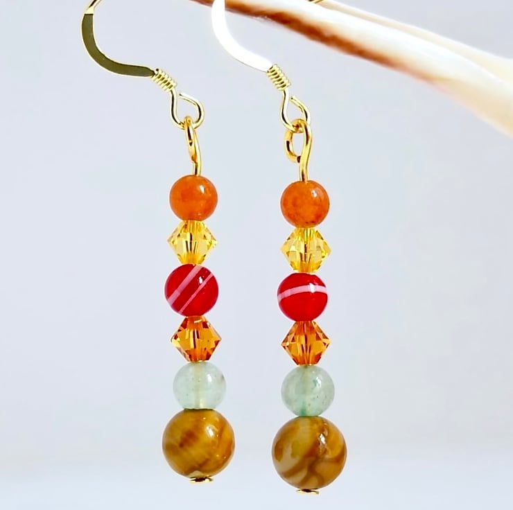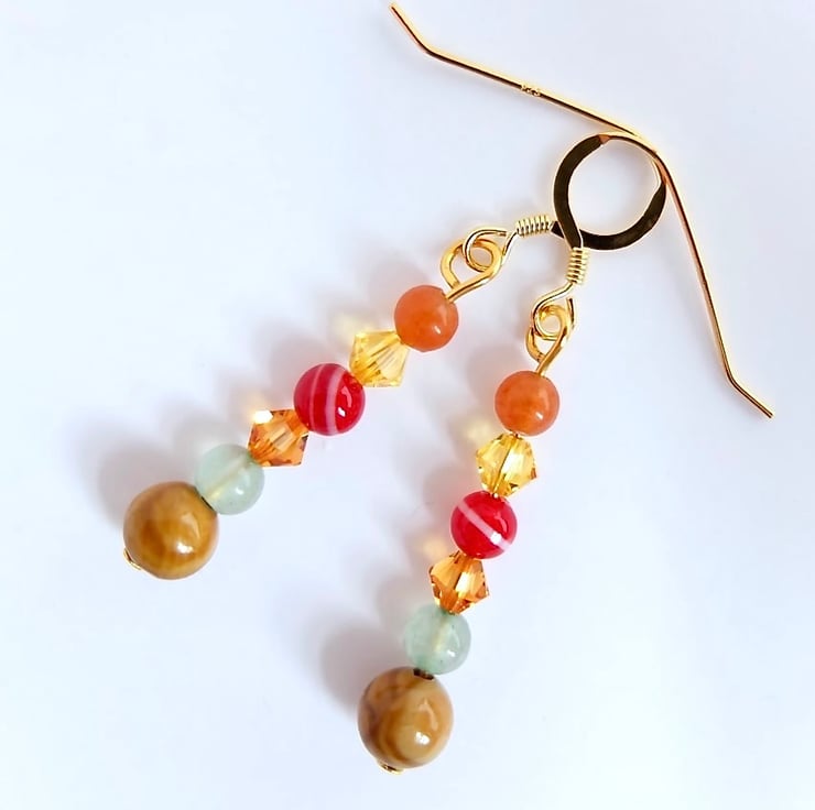 The earrings feature a 6mm wood lace Agate bead topped with 4mm green Aventurine, Swarovski 'topaz', red Agate, Swarovski 'light topaz' and peach Aventurine.