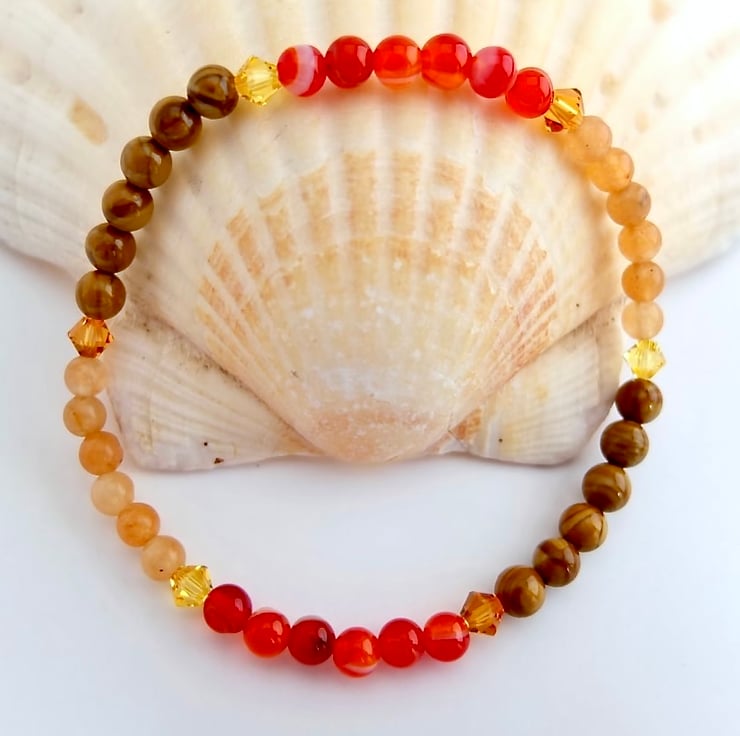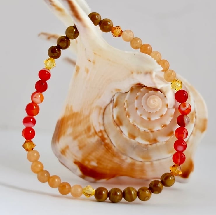 The dainty bracelet features bands of red Agate, wood lace Agate and peach Aventurine separated by Swarovski crystals of 'topaz' and 'light topaz'.