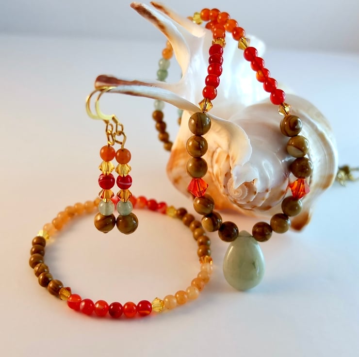 A three-piece jewellery set, necklace, bracelet and earrings, in Autumn shades of red, orange, green and brown.