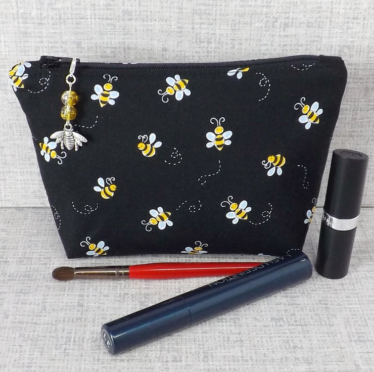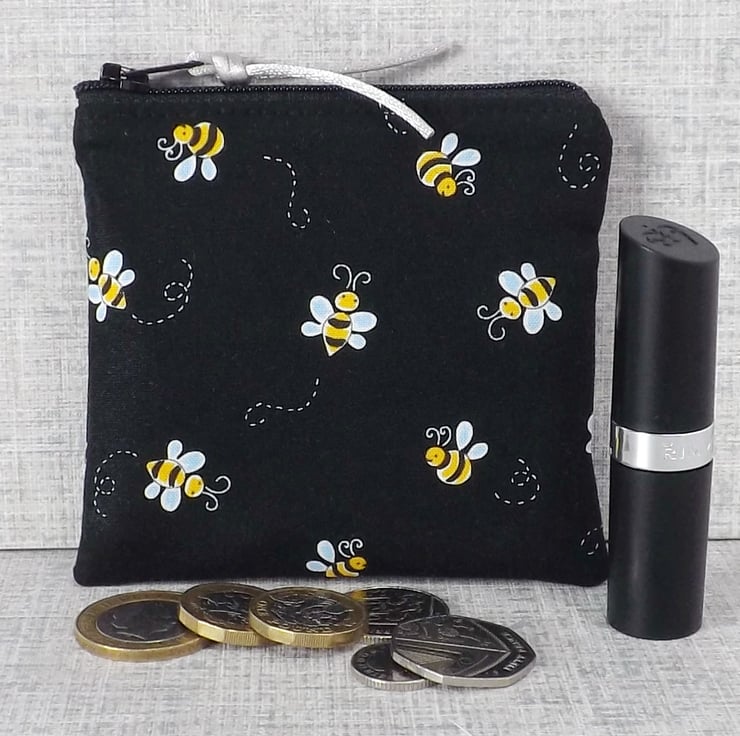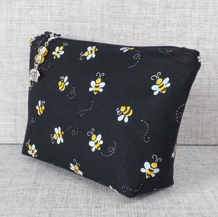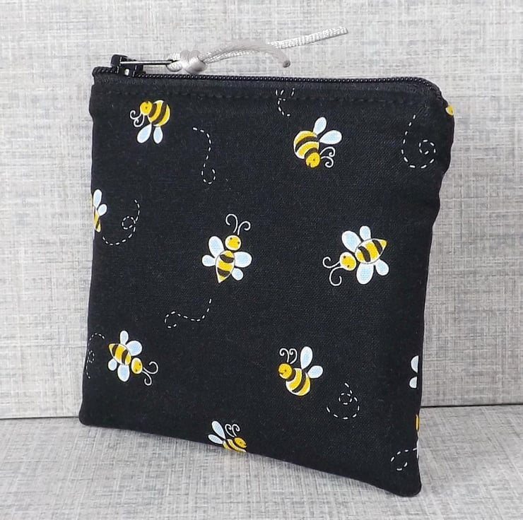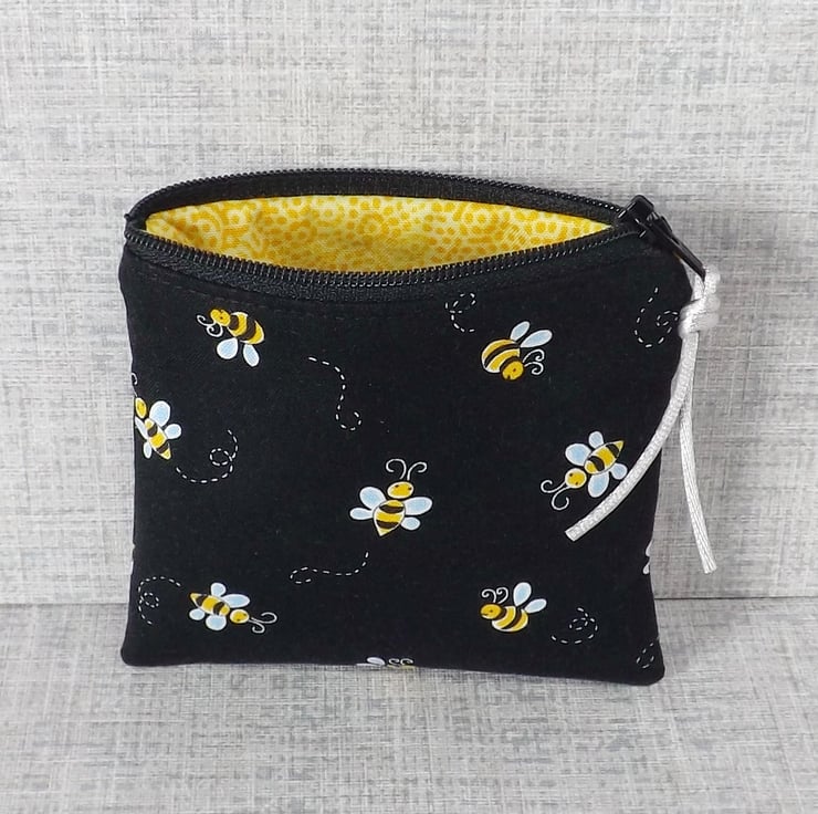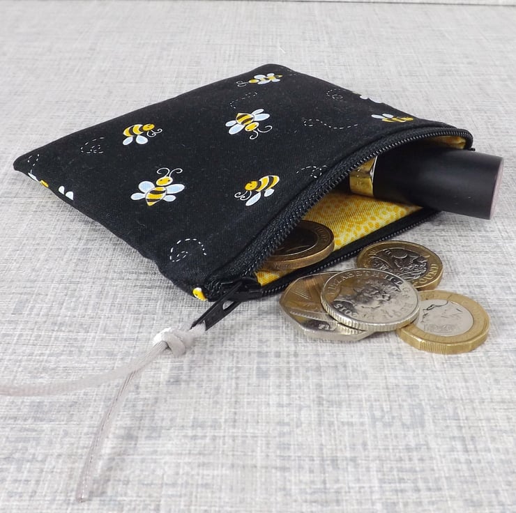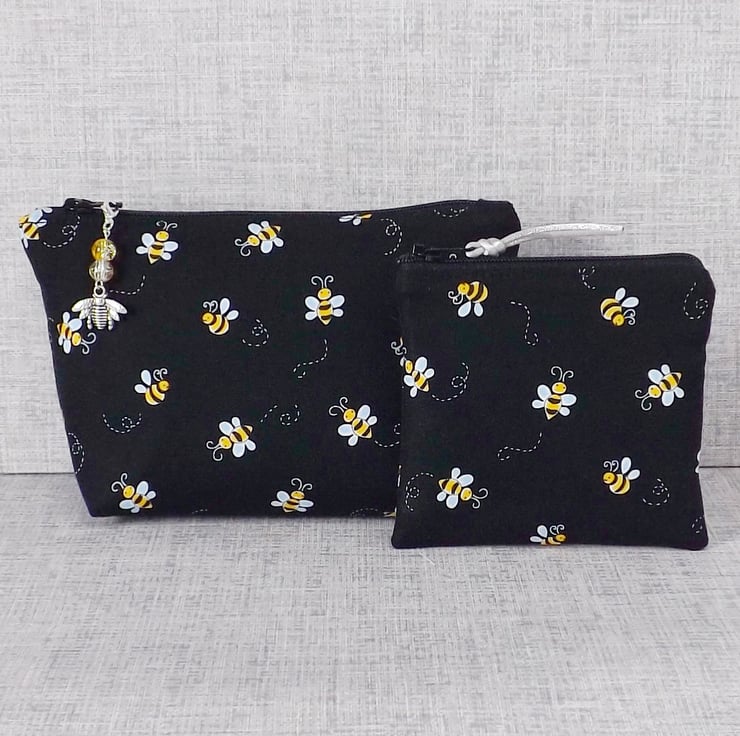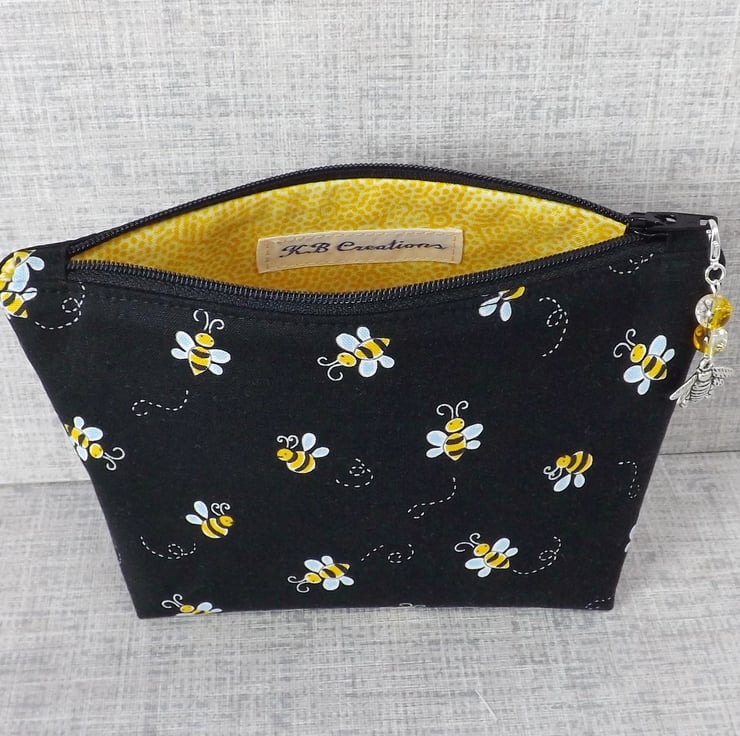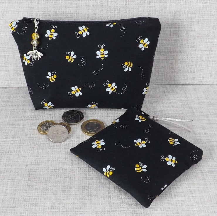 The fabrics have been backed with fusible interfacing to give body to the bag. There is a zip closure on the top of the make up bag with a bead & bee charm on the zipper pull. The coin purse also has a zip closure at the top, with some matching cord on the zipper pull.