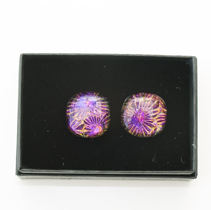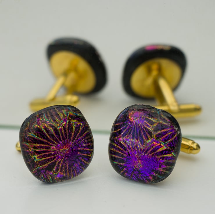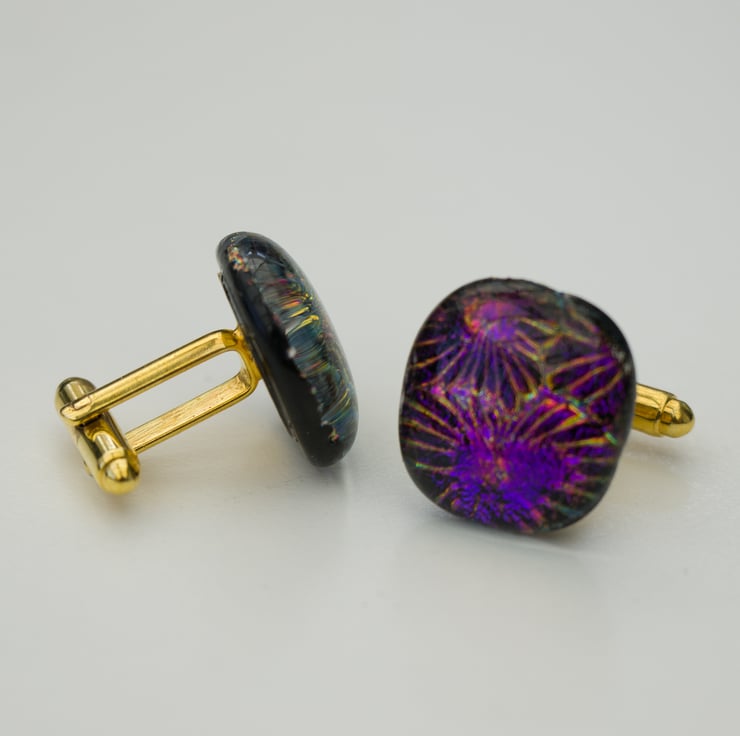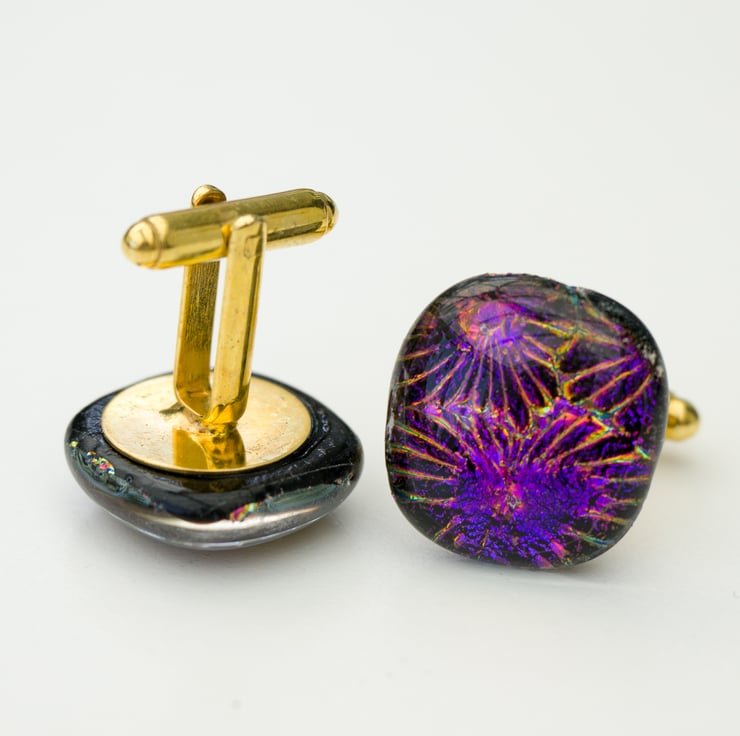 Each piece is constructed from a square of dichroic glass that is capped with a square of clear glass. Each cufflink is approximately 2cm square.