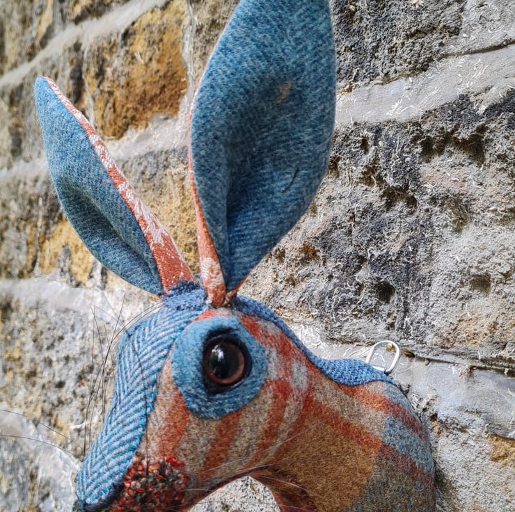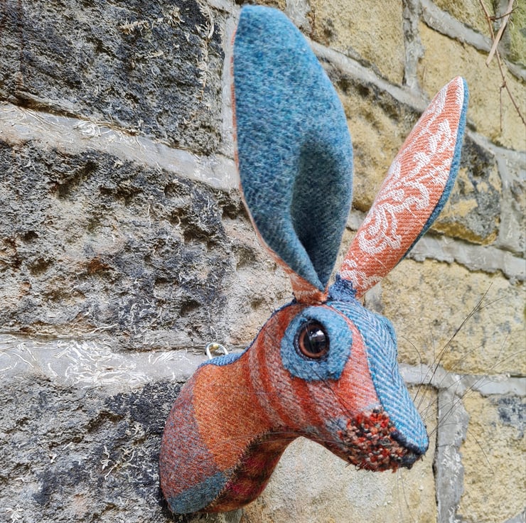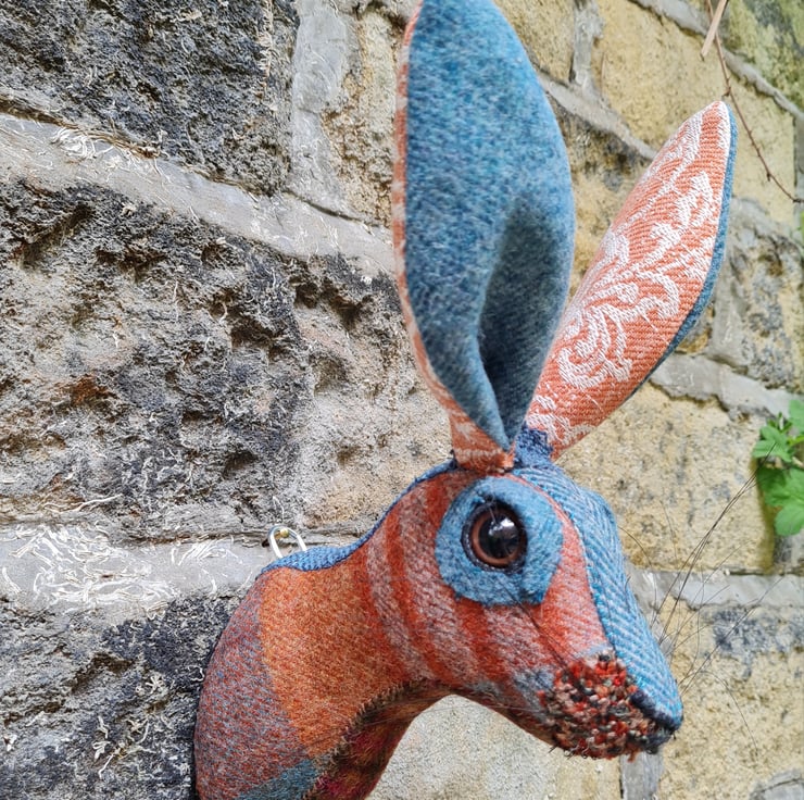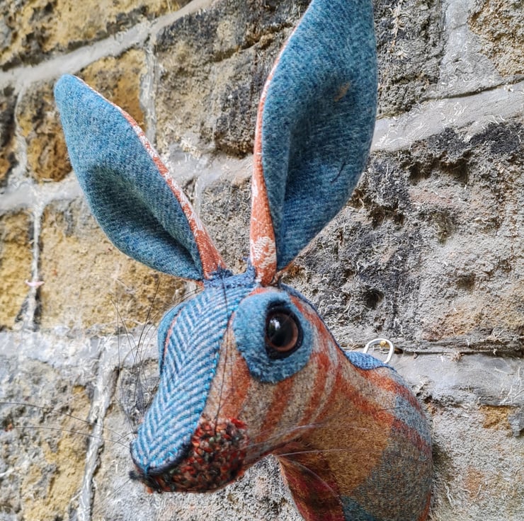 A lifesize textile hare head which I have hand stitched with an array of colourful upholstery and wool fabric.