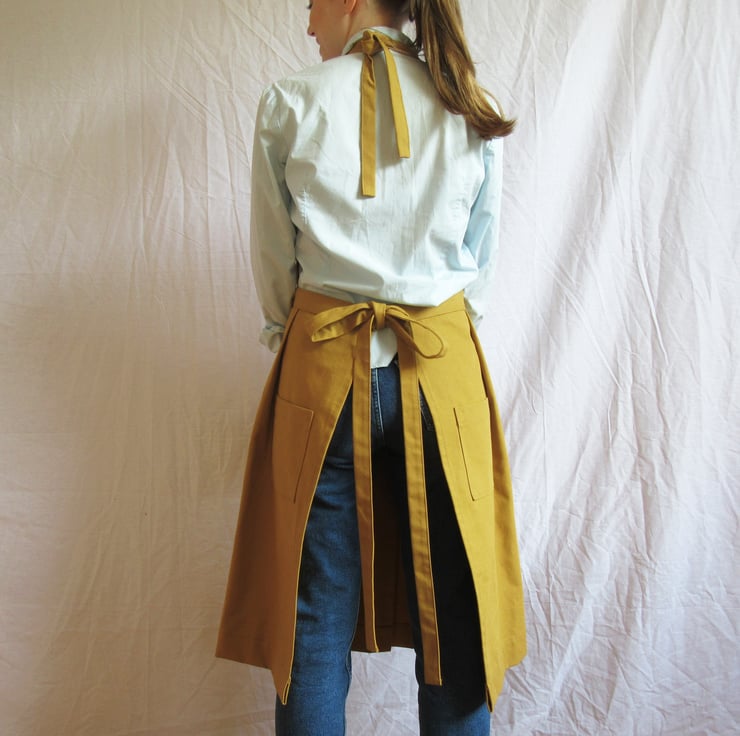 APRON DETAILS: Tough medium-heavyweight canvas - Pleated skirt - Split leg - Bib pocket - 2 skirt pockets - Strongly constructed - Thoroughly researched & tested design - Sustainable small batch making