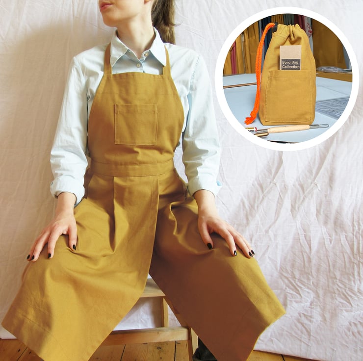 My best-selling apron - attractive yet superbly functional, PLUS a matching tool bag. A pleated skirt and overlapped split gives great coverage ensuring legs are covered when sitting at a potters wheel or work bench. Beautifully sewn and made to last, this apron is highly specialised craftsperson's workwear. The useful little drawstring bag is made from small remnants leftover from making No4:5 & No14:2 aprons.