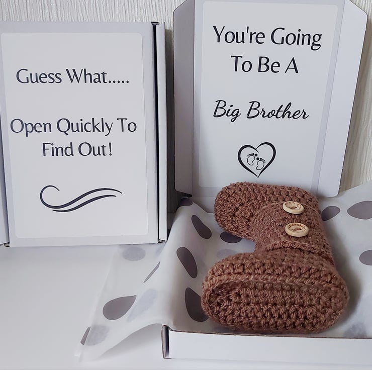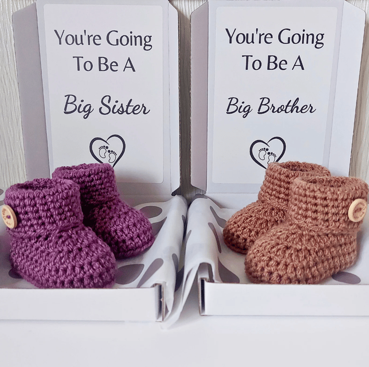 Looking for a special way to share your pregnancy news with your child? These handmade boxed baby booties make a heartwarming surprise for future big brothers or sisters.
