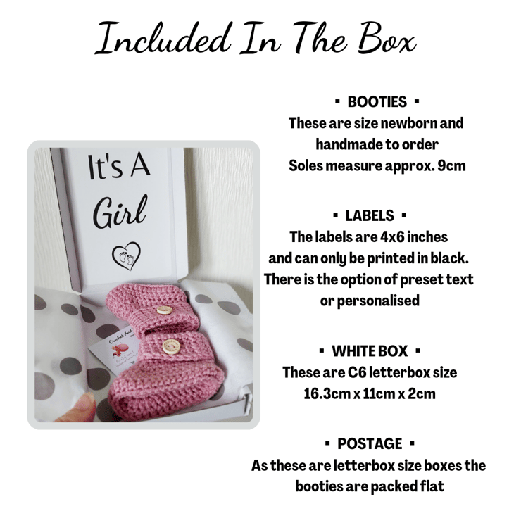 Each gift includes a pair of newborn-sized hand-crocheted booties nestled in tissue paper inside a letterbox-friendly box.