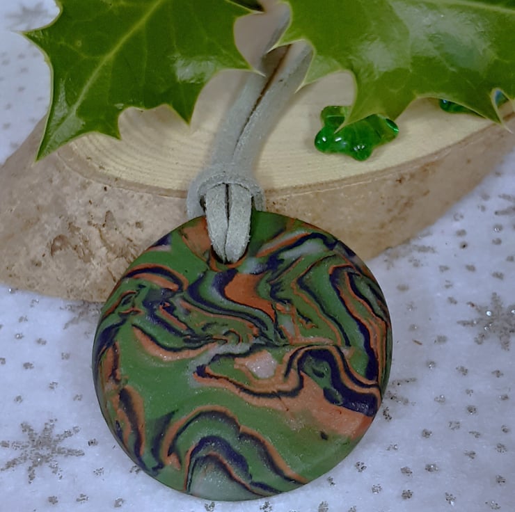 A handmade pendant made from a blend of sage green, sienna and navy polymer clay in a unique swirl design