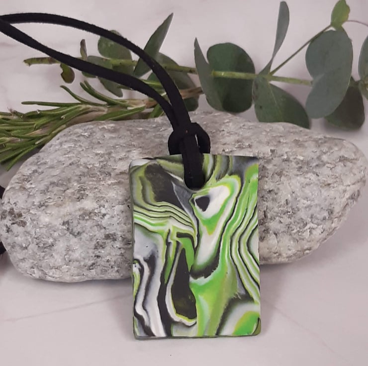 A rectangular pendant handmade from a blend bright green, black, white and silver polymer clay to create a unique swirl design.