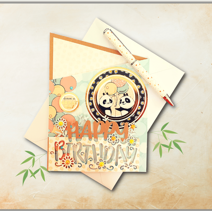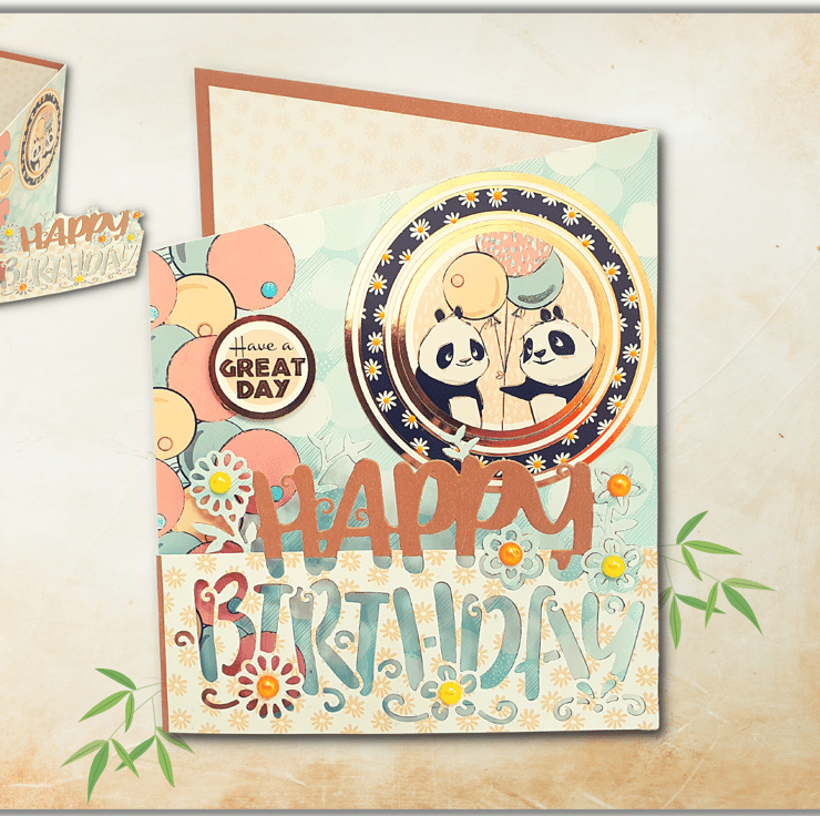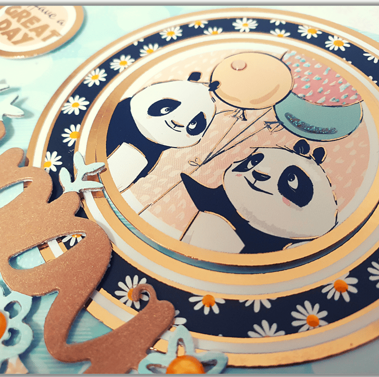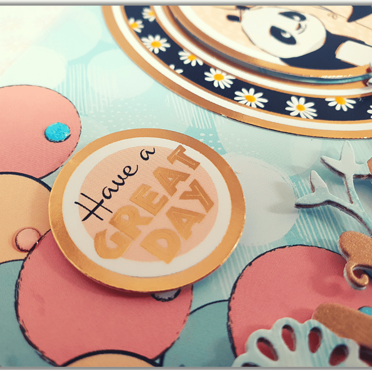 The middle panel is layered with a 350gsm balloon patterned card and is decorated with a big round topper featuring the two pandas, as well as a small topper that displays the sentiment "Have a great day".