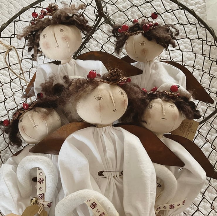 Her hair is natural curly fleece, so no two dolls hair is identical, finished off with a natural twisted wire halo, trimmed with artificial pip berries.
