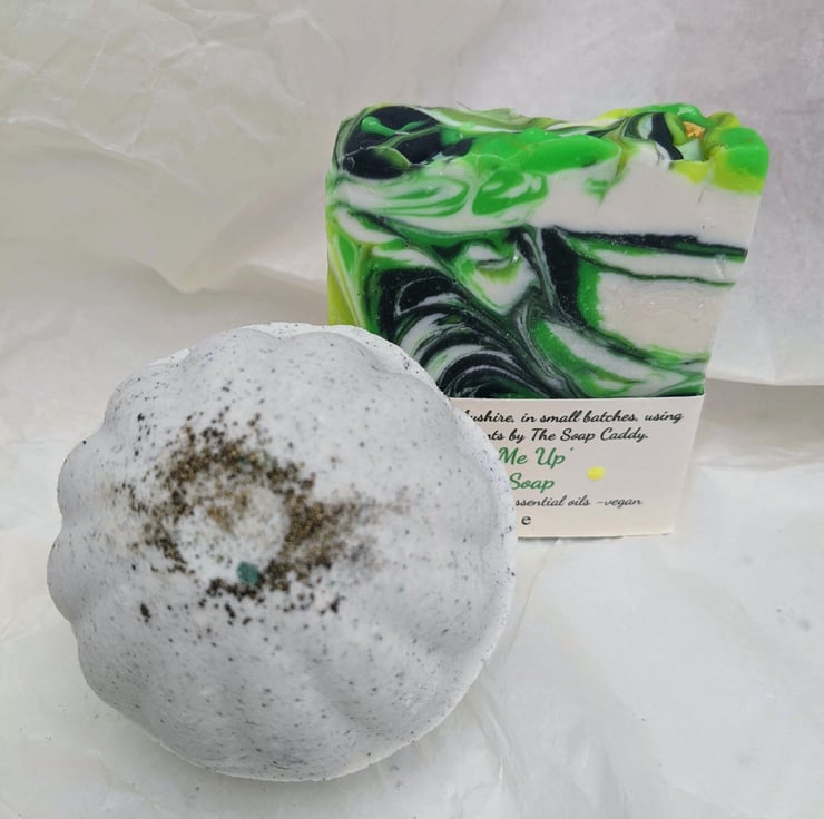 Wake Me Up Citrus Bath bomb; a botanical bomb containing green clay and the same essential oil blend as the soap listed above.
