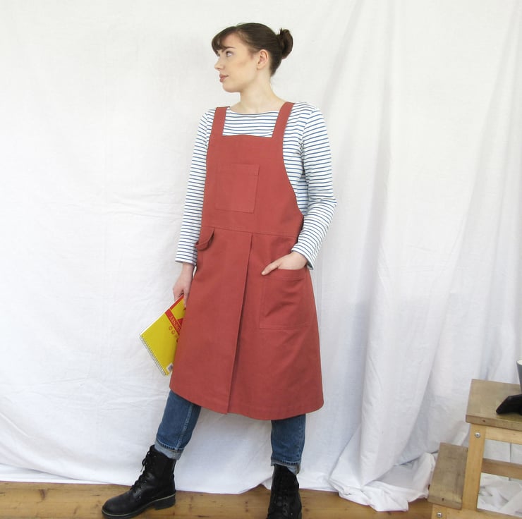 Pinafore style workwear apron in a lovely dusty red-pink colour canvas. Designed for potters, artists & makers, the split skirt allows lots of movement, and ensures each leg is covered when sitting at the wheel or work bench. Beautifully sewn and made-to-last, this apron is highly specialised workwear for craftspeople. The mini tool bag is handy for storing artists & potters tools and materials, it's made from small remnants leftover from making aprons.
