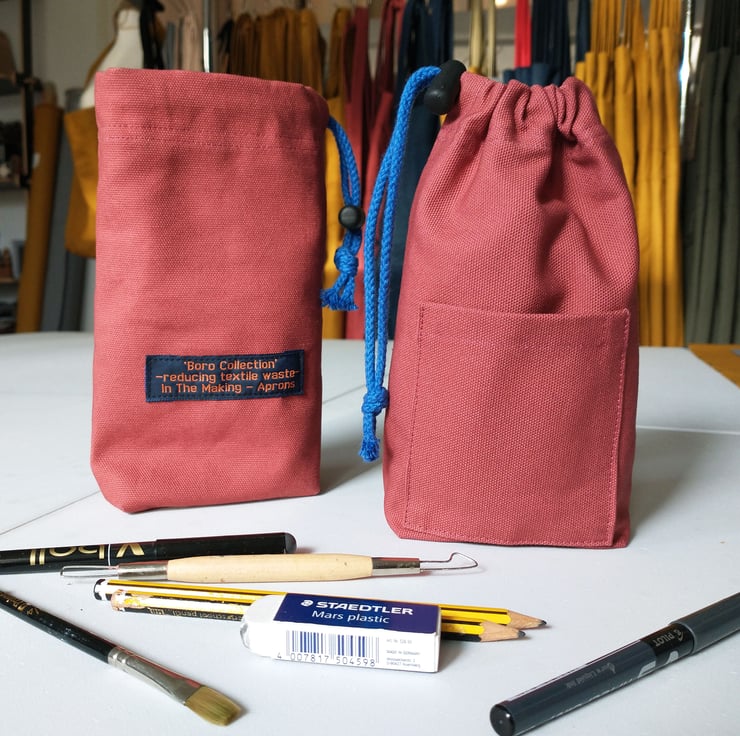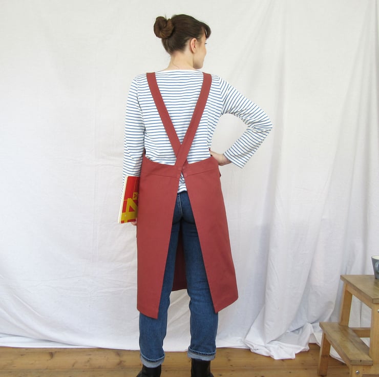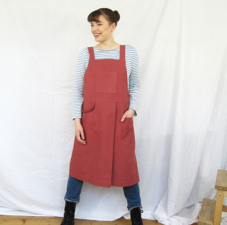 Pinafore style workwear apron in a lovely dusty red-pink colour canvas. Designed for potters, artists & makers, the split skirt allows lots of movement, and ensures each leg is covered when sitting at the wheel or work bench. Beautifully sewn and made-to-last, this apron is highly specialised workwear for craftspeople. The mini tool bag is handy for storing artists & potters tools and materials, it's made from small remnants leftover from making aprons.