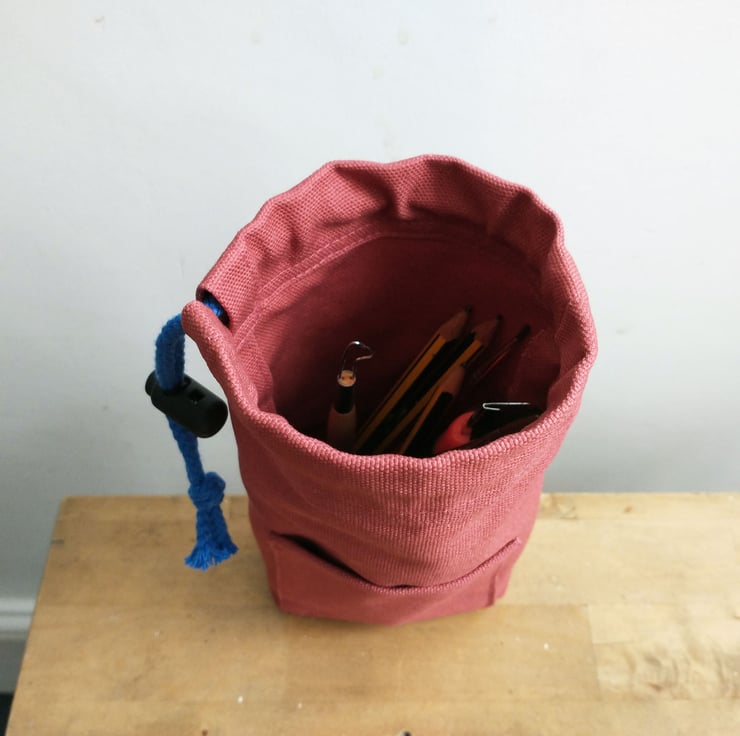 BAG DESIGN: Tough canvas - Fits variety of pens, pencils, carving tools, paint brushes up to 20cm/8" long - Outside pocket - Drawstring closure with spring loaded cord lock