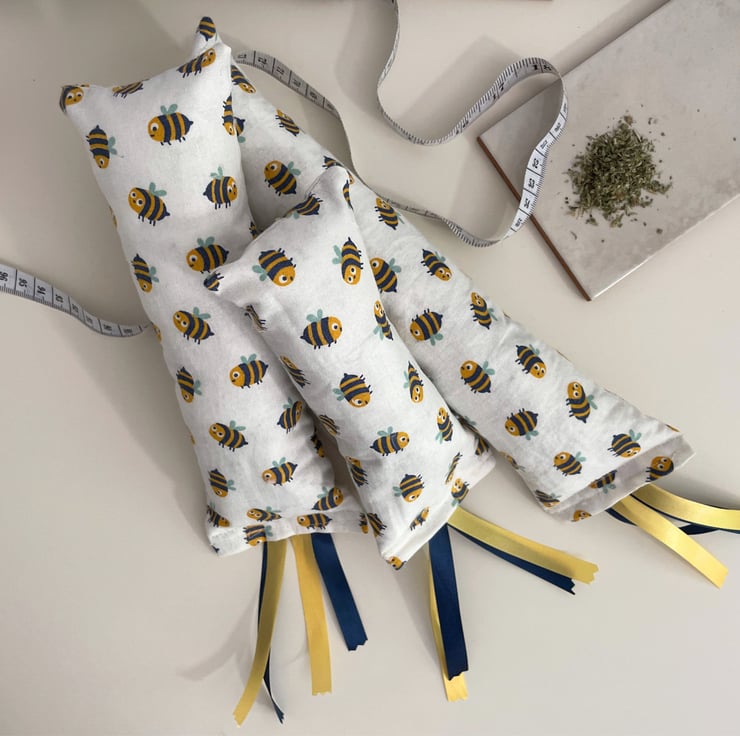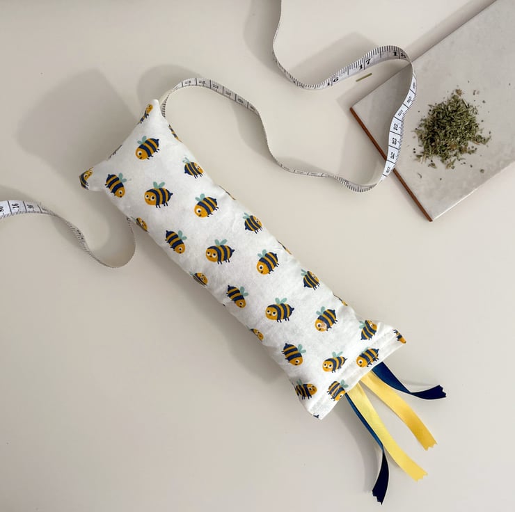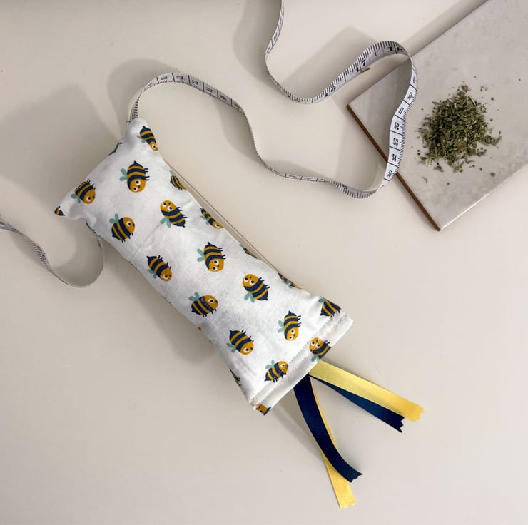 Cat kicker toy handcrafted with strong potent catnip and ribbons. Handmade with sustainable, climate-conscious materials. Features a nature-inspired, spring bee pattern on white background.