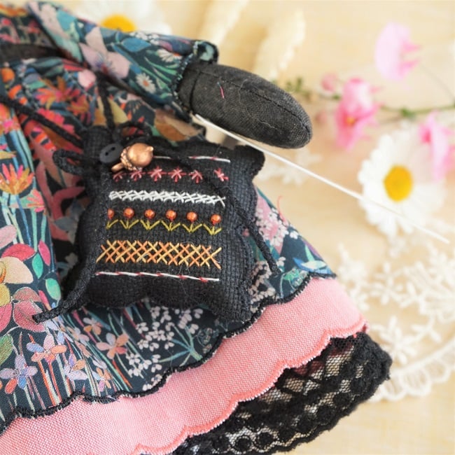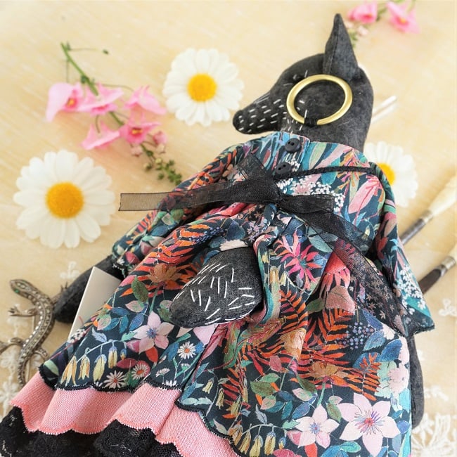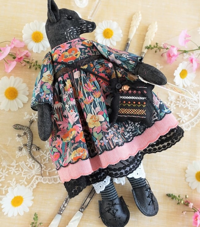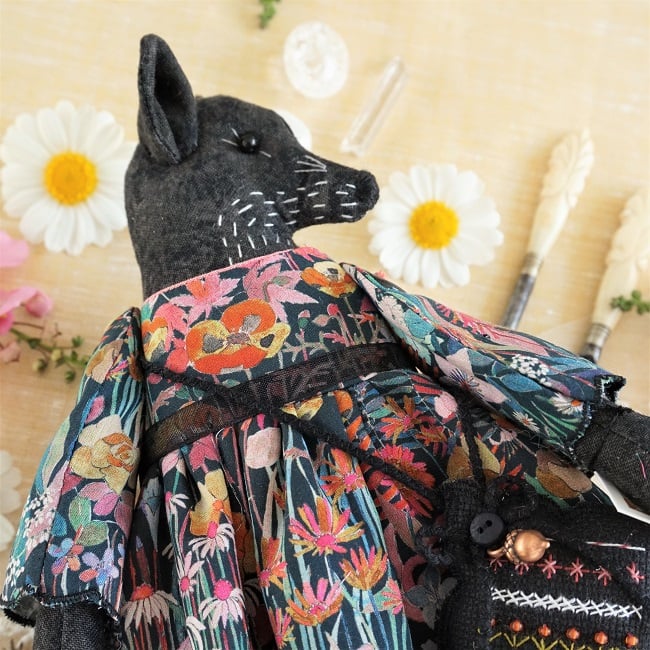 This little black vixen is dressed in such a lovely Liberty print with a black ground and watercolour wildflowers flowing over her dress, teamed with Tilda Chambray Coral and a lovely black lace. One of the first midnight vixens of the summer xx