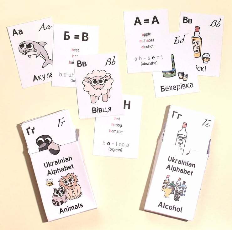 One pack of Ukrainian alphabet cards to help with learning Cyrillic (a choice of alcohol or animals).