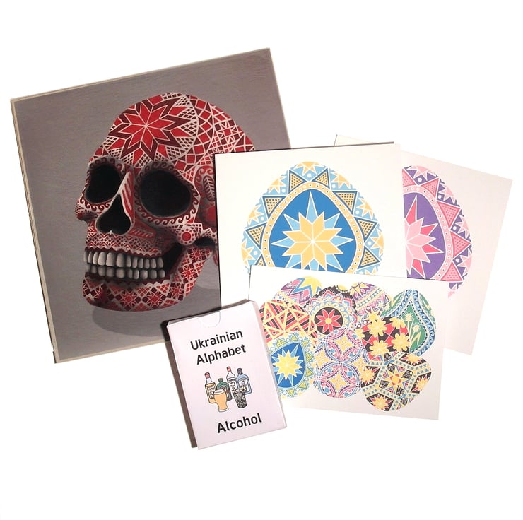 The set includes one 8" print (a choice of the "Ukrainian to the Bone" skull print, or the pysanka patterned chicken print).