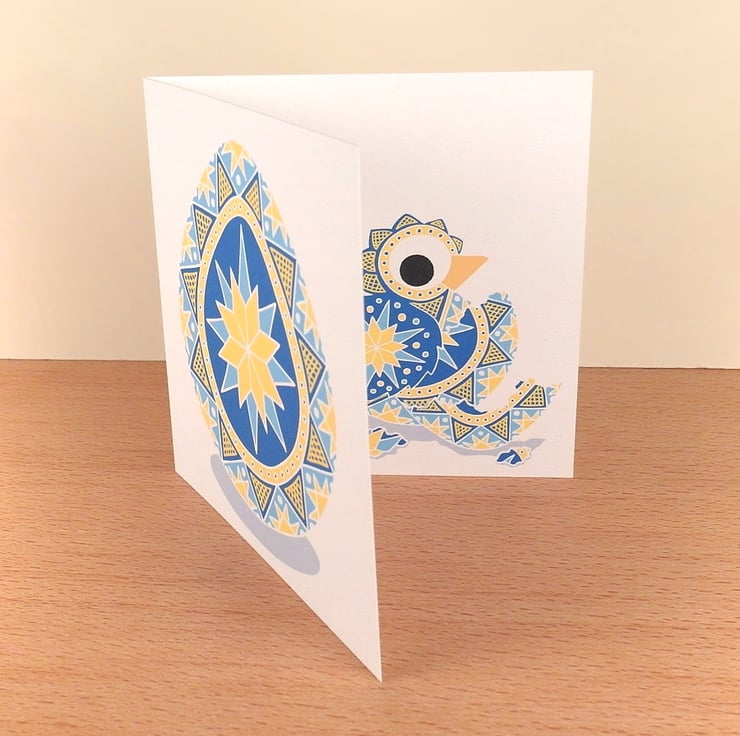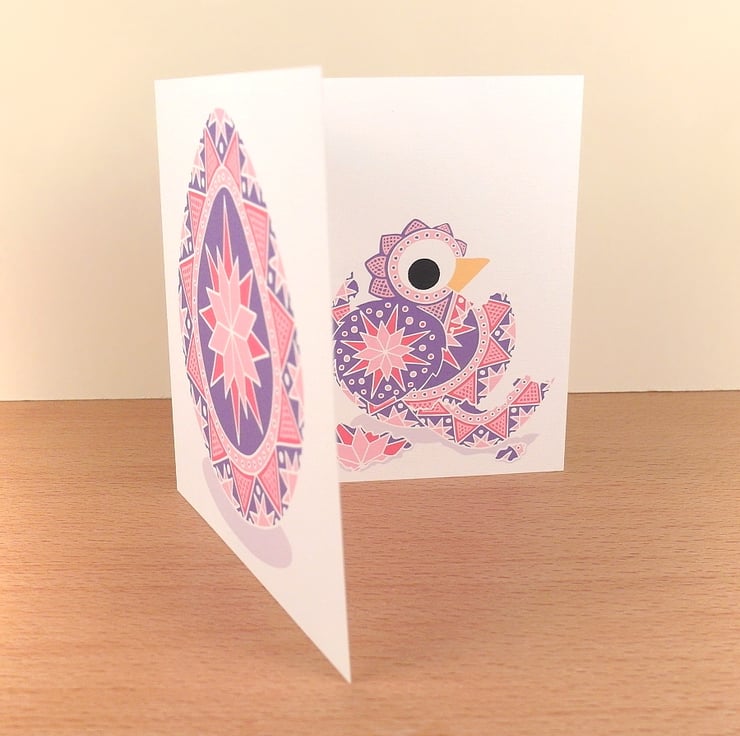 3 greetings cards, all without a message so suitable for a variety of occasions - one card with many colourful pysanky eggs, one blue and yellow pysanka egg with hatching chick inside, one purple and pink pysanka egg with hatching chick inside.