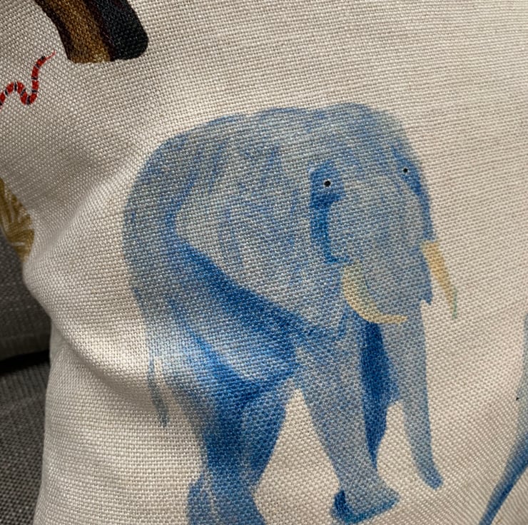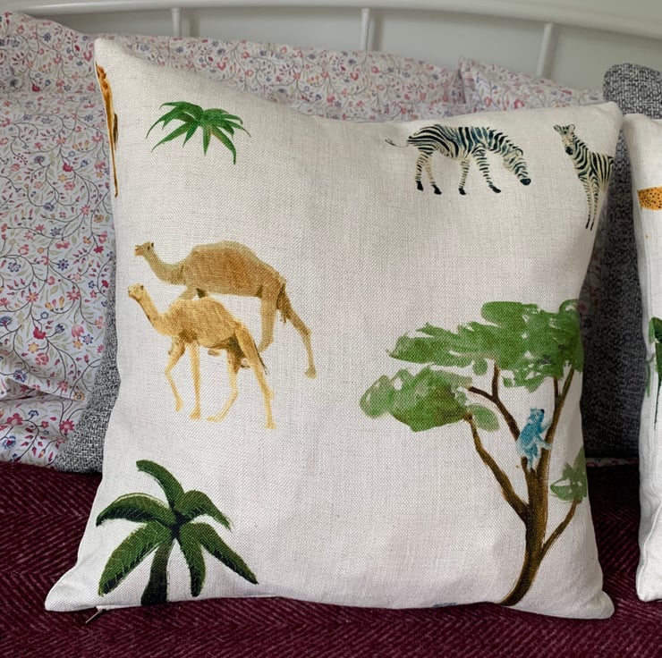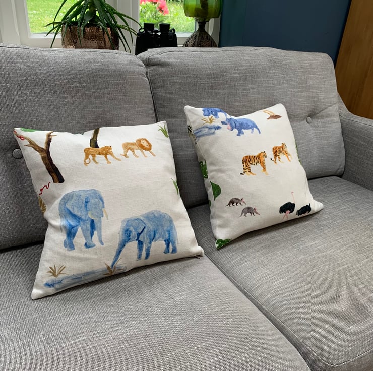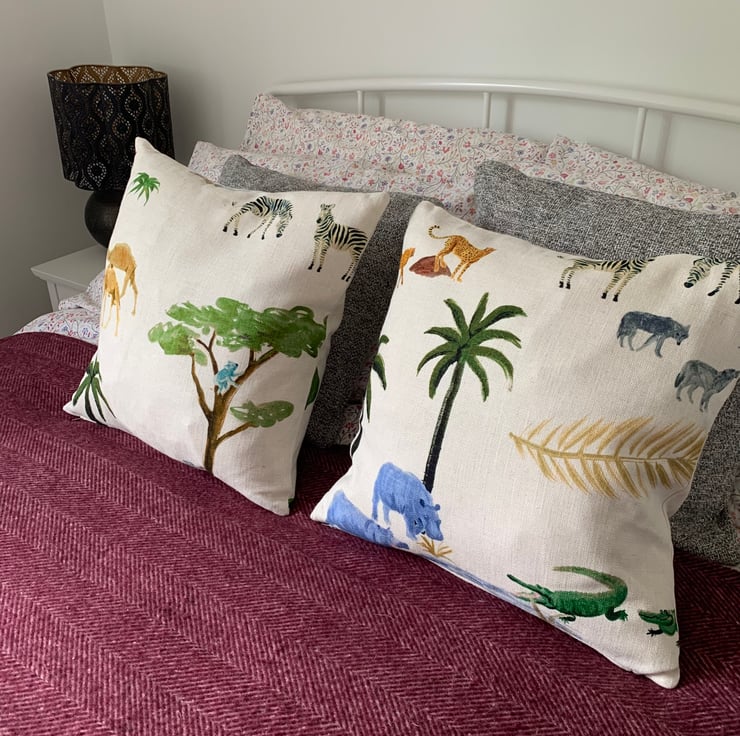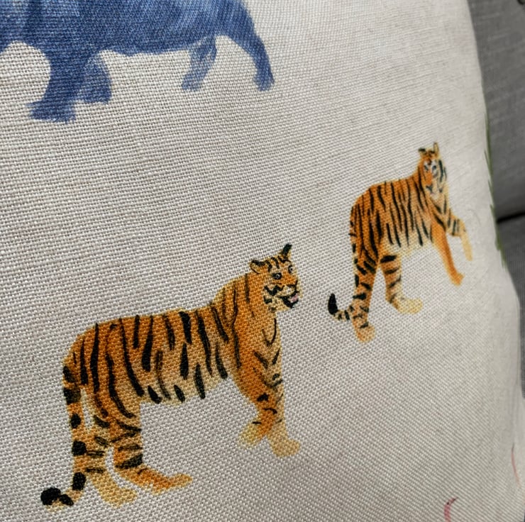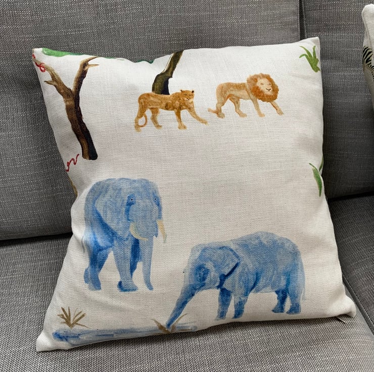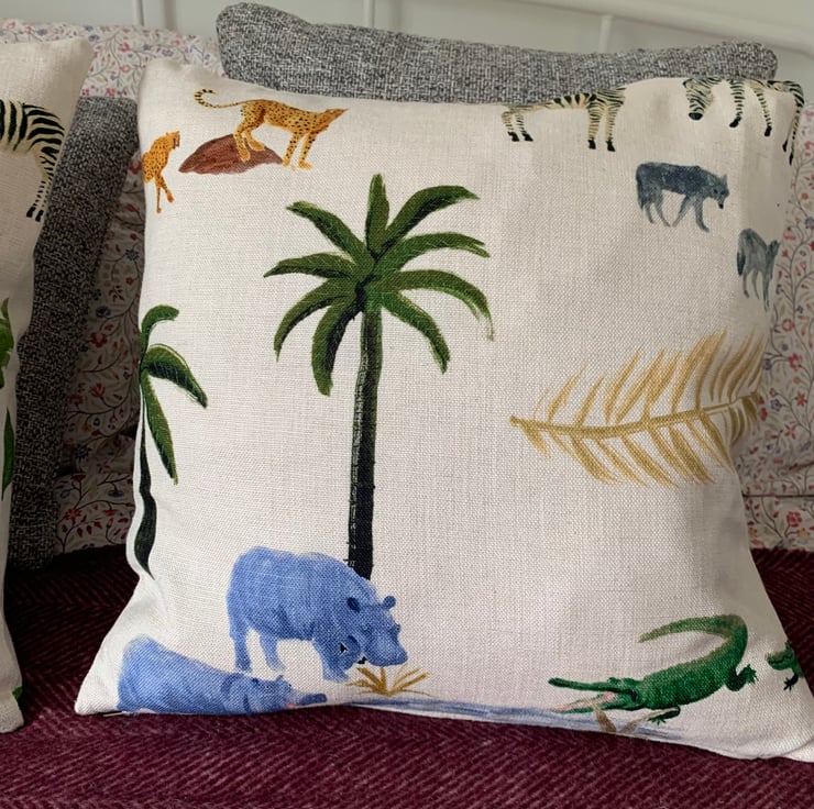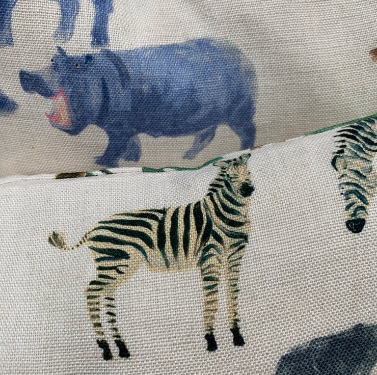 Fun cushion cover in Andrew Martin’s Noah linen-mix fabric. This double sided cushion cover features zebras, lions, hippos, tigers, elephants and lots more. Pattern placement varies so if you are keen to see a particular animal please message me.