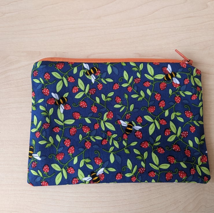 The item measures approx. 6" (15cm) by 4.5" (11.5cm). It doesn't contain any inside pockets and is a zipper pouch style.