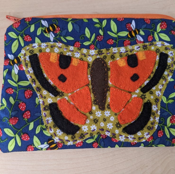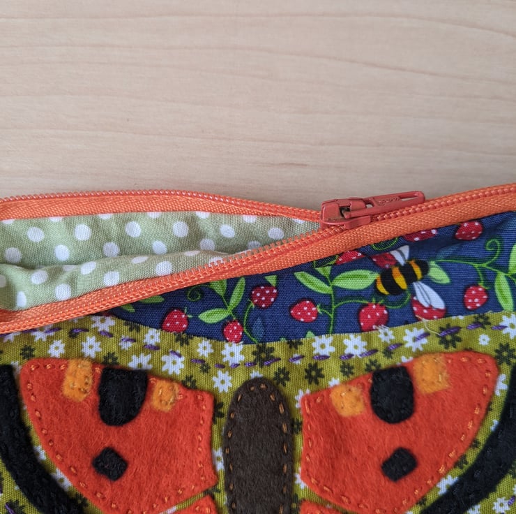 Lined, handmade and hand-appliquéd butterfly purse with orange zip and green polka-dot lining.