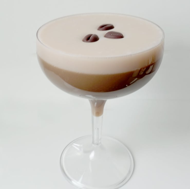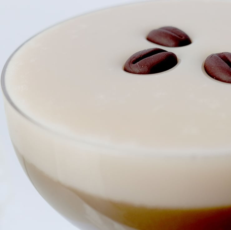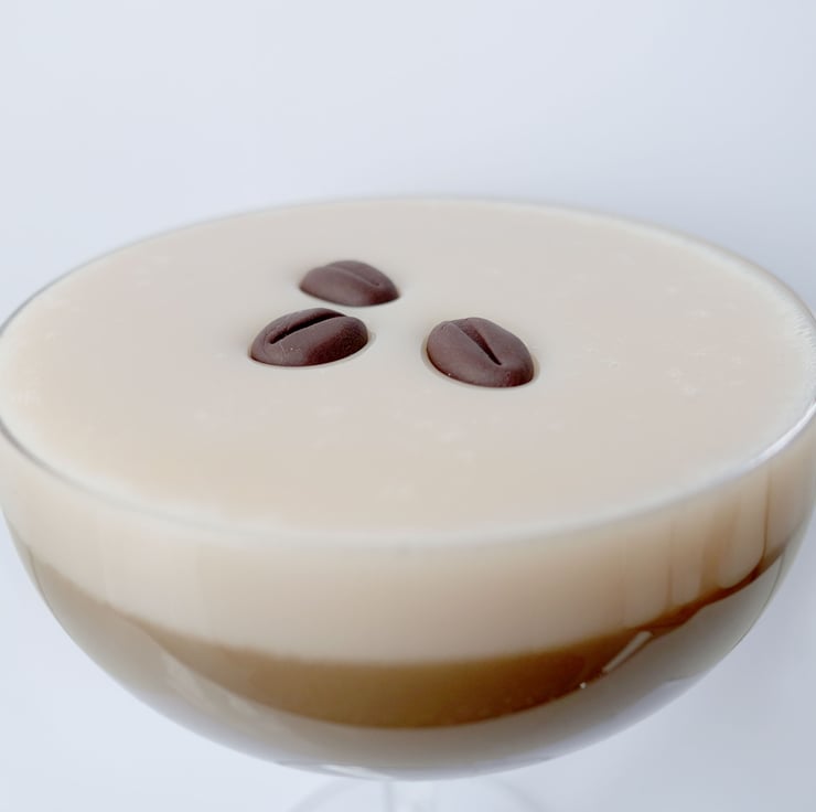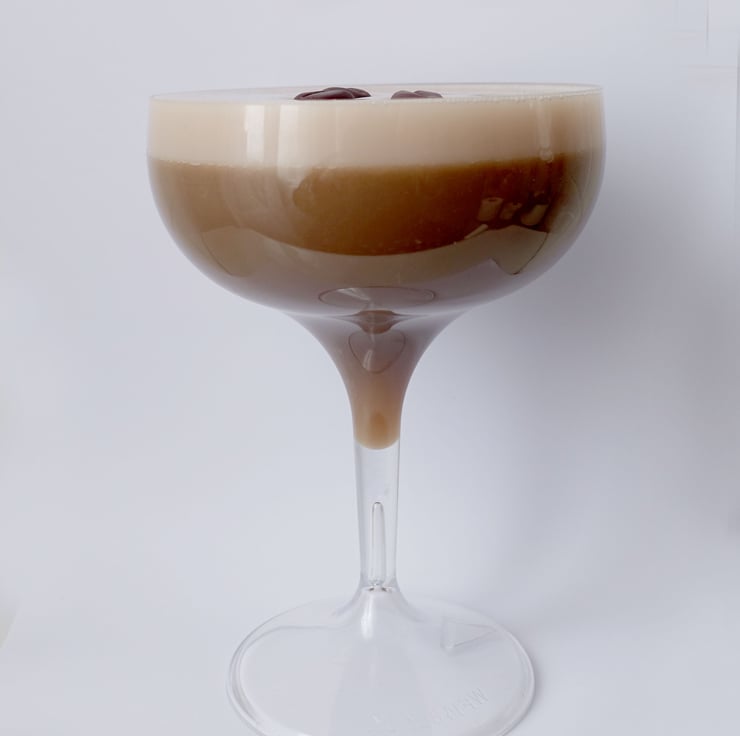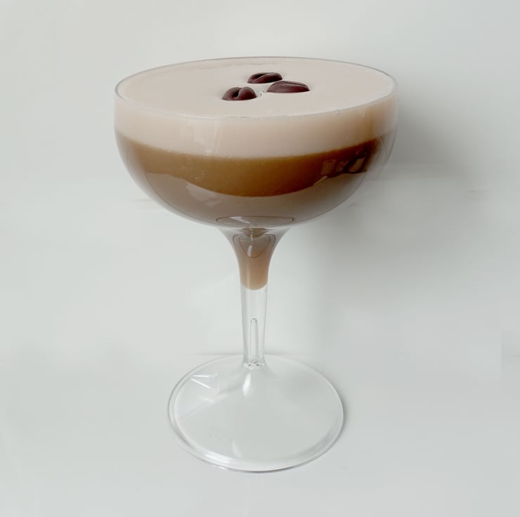 Expresso Coffee Fake Food cocktail in a coupe glass made from a safety crystal clear polycarbonate. Idea for props for photographers, TV and Theatre and Retail decoration and display.