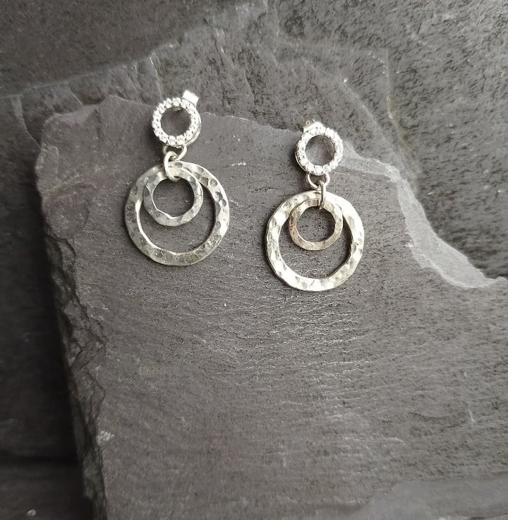 A pair of textured sterling silver dropper earrings, set with cubic zirconia stones.