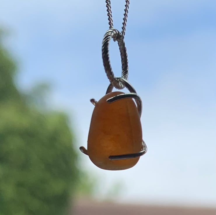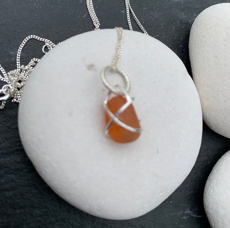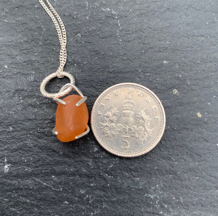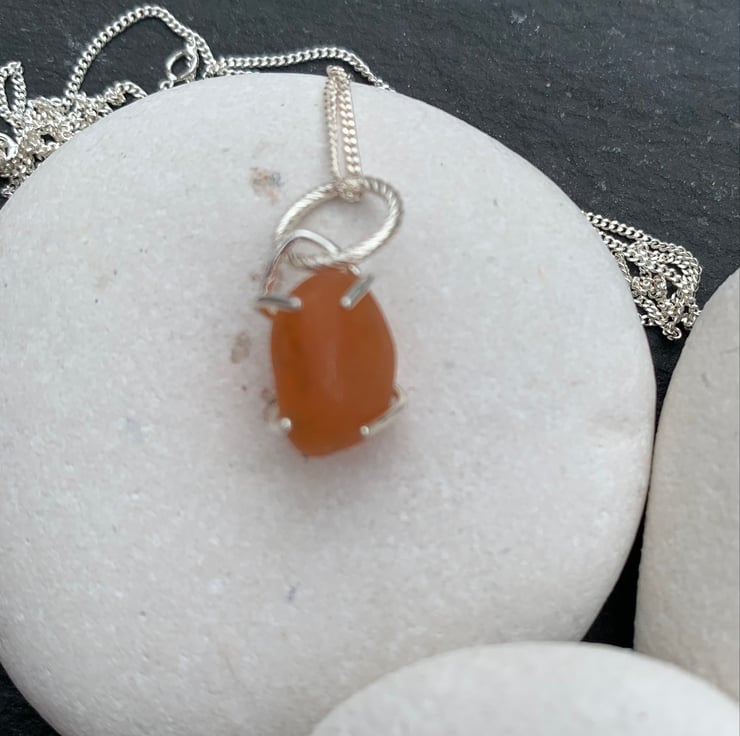 The piece of carnelian (I believe) stone was collected from Withernsea beach in East Yorkshire and has not been tumbled or polished in any way. It measures 1.2cm in length, 0.8cm in depth and 0.7 across. The Sterling silver claw mount is an ideal way to use the more irregular shaped pieces I collect from the beach and shows this stone off perfectly, allowing light from all angles to show the colours off.