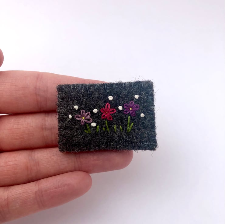 A hand embroidered brooch with simple daisy-like flowers sitting in a row on a dark grey wool felt background. There is one lavender, one red and one purple flower all with little green stems and leaves.