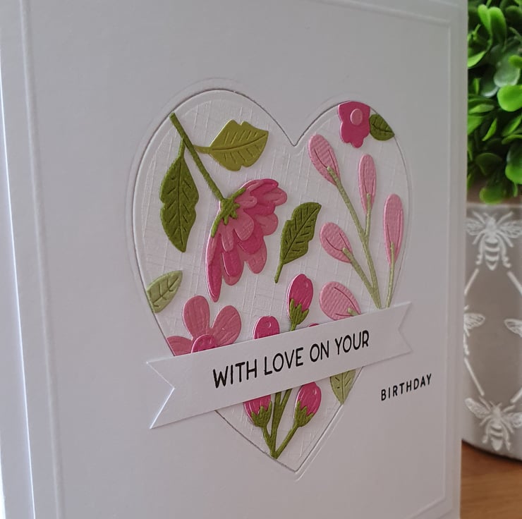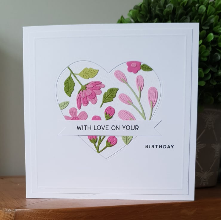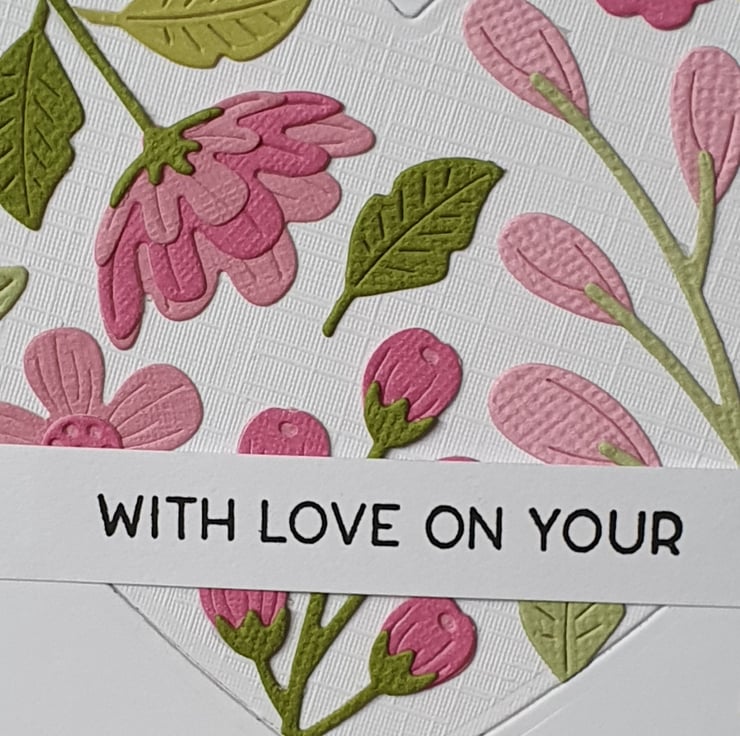 This pretty card features a heart in the centre covered with diecut flowers in various shades of pink with green foliage. The flowers on the heart almost have an ''embroidered look' to them and are very tactile.