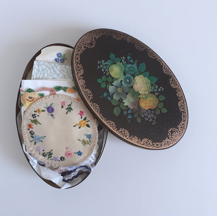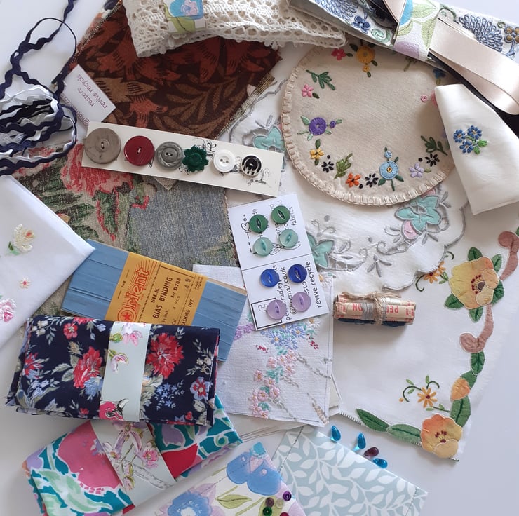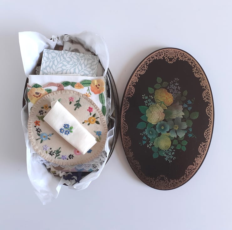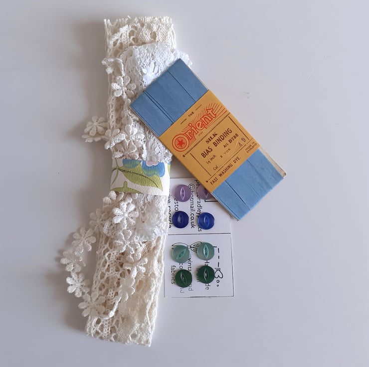 I have so many pretty fragments, full of history and charm, in my studio. I wanted to curate them into little boxes and tins to inspire people to sew, the way back in the day I was inspired by my Mums sewing box. So now, if I see a little box or tin at the car boot, I buy it to fill with these things. Perfect for beautiful bundles weekend.