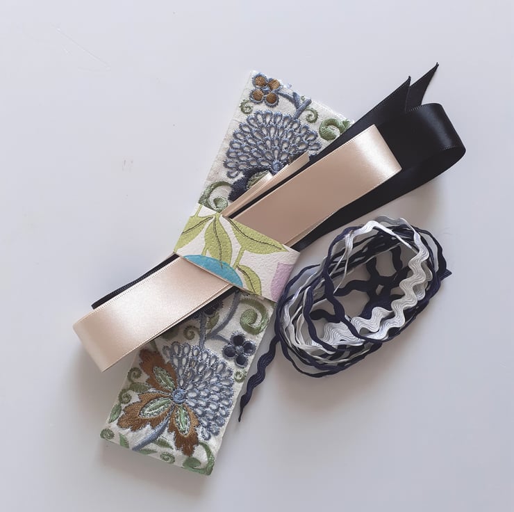 Strips of polyester satin ribbon, ric-rac braid and salvaged cotton lace