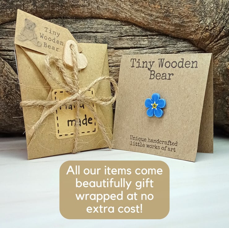 This handmade wooden forget me not pin is small and discrete but exquisitely and delicately hand painted. Use it to symbolise remembrance and love for someone you have lost, or give it as a bereavement gift. Giving it to someone who is leaving shows they will be remembered.