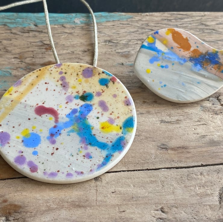 The handmade pendant has been formed from clay and decorated in a contemporary palette of Grey, Blues,Orange and lilacs. Hung on an adjustable cotton cord. So lightweight and easy to wear a perfect artisan piece for adding a little something extra to an outfit.