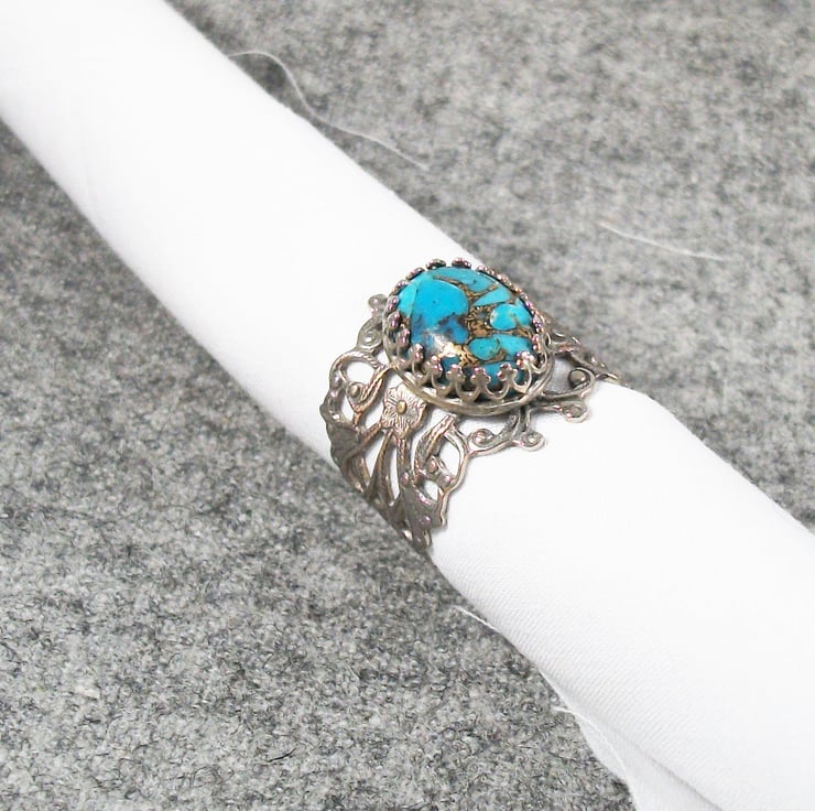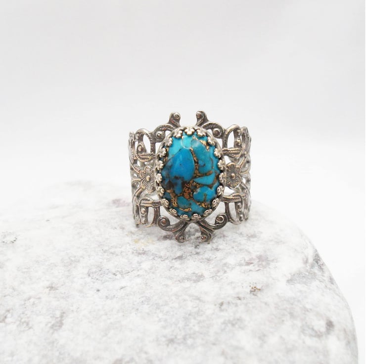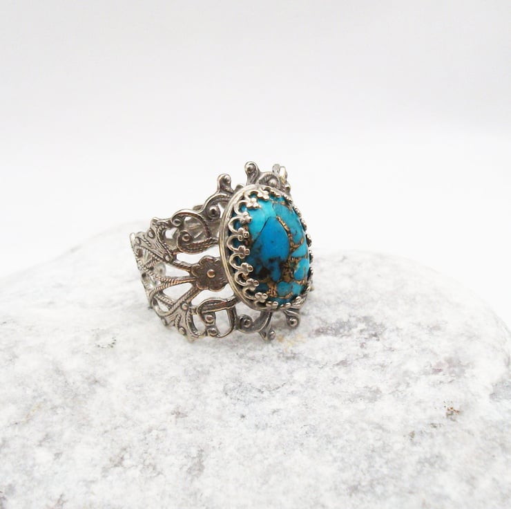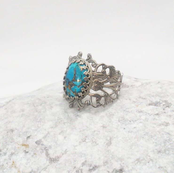 Silver plated filigree turquoise ring.