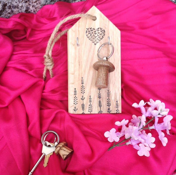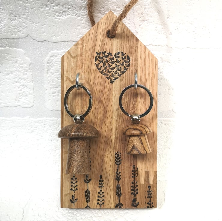 Created especially for the Folksy Beautiful Bundles event, using reclaimed wood a cute key holder wall decoration with 2 Mushroom shaped Keyrings.
