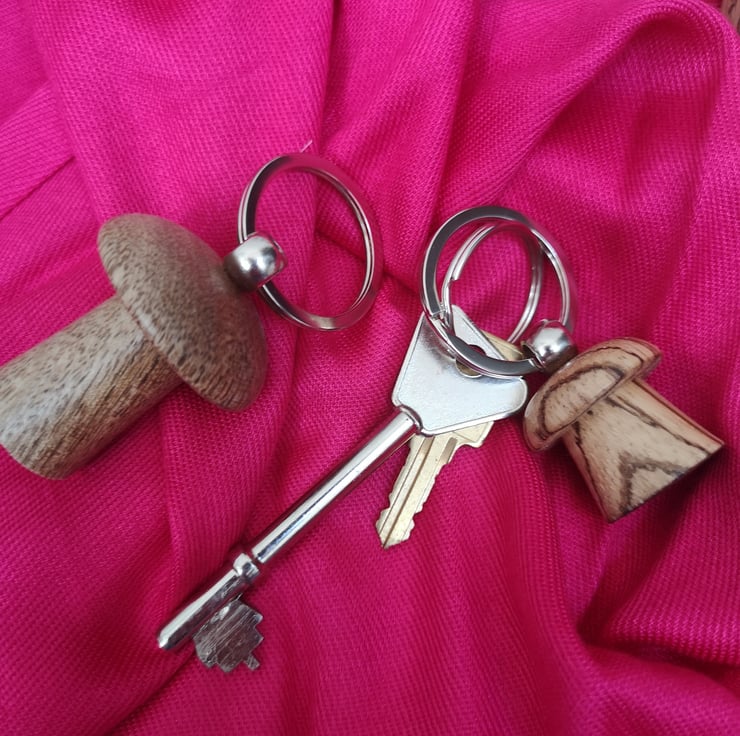 Keyrings - woodturned Mushroom shape, one is made from Zebrano wood, one is Oak with stainless steel key ring attachment